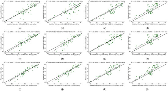 The scatter plots (a–l) compare the accuracies of LUE- and WOFOST-modelled yields (inputting the 8- and 16-day MOD13Q1, L-MOD13Q1 and S-MOD13Q1) with the referenced yield of WW. The green dots represent WW. Every plot contains a solid line to visualise the correlation of pixels between the referenced and modelled yield values.