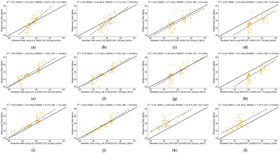 The scatter plots (a–l) compare the accuracies of LUE- and WOFOST-modelled yields (inputting the 8- and 16-day MOD13Q1, L-MOD13Q1, and S-MOD13Q1) with the referenced yield of OSR. The orange dots represent OSR. Every plot contains a solid line to visualise the correlation of pixels between the referenced and modelled yield values.