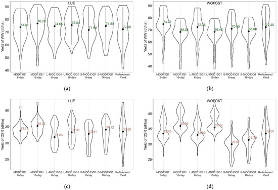 The violin plots compare the crop yields of referenced (at 95% confidence interval) and modelled yields obtained from multi-source data (MOD13Q1, L-MOD13Q1, and S-MOD13Q1) at 8 and 16 days of temporal scales of (a,b) WW and (b,d) OSR using the (a,c) LUE and (b,d) WOFOST models in 2019. The green-coloured text represents WW and the orange-coloured text represents OSR. The text values represent the median yield values of every product.