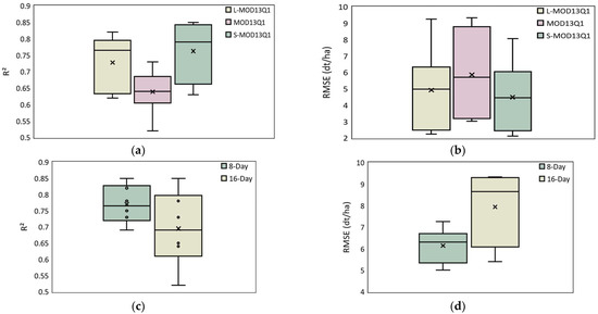 The box plots compare the accuracies (a,c) R2 and (b,d) RMSE of referenced (at 95% confidence interval) and modelled yields obtained from multi-source data: MOD13Q1, L-MOD13Q1, and S-MOD13Q1 at temporal scales of 8 and 16 days.