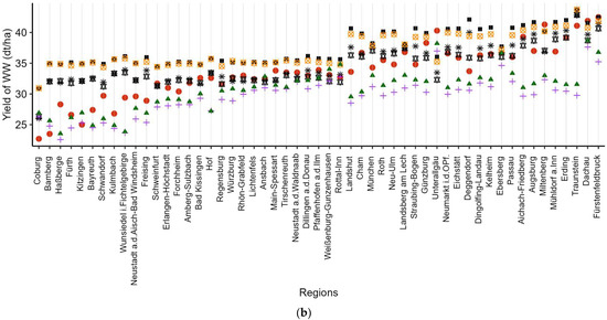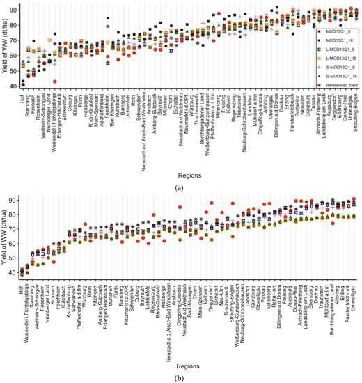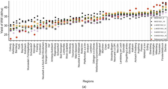 The spatial comparison of crop yield at the regional level from the referenced and modelled yields with multi-source data was displayed for both WW and OSR (Figure 10, Figure 11, Figure 12 and Figure 13). For WW, the LUE model showed consistency in yield prediction for regions such as Straubing-Bogen, Bad Kissingen, Landsberg am Lech, Dillingen a.d. Donau, Fresing, Würzburg, Neuburg-Schrobenhausen, Fürth, Neustadt a.d. Aisch, Bad Windsheim, Rhön-Grabfeld, Oberallgäu, Regensburg, Aschaffenburg, and Ansbach for all satellite inputs. However, the WOFOST model showed stability for regions such as Freising, Tirschenreuth, Neustadt a.d. Waldnaab, Kitzingen, Fürth, Schweinfurt, Weißenburg-Gunzenhausen, Neustadt a.d. Aisch-Bad Windsheim, and Kulmbach. The S-MOD13Q1 8-day showed higher spatial accuracy than other remote sensing inputs used in both models. The S-MOD13Q1 8-day product with LUE predicted a higher yield of more than 85 dt/ha for regions such as Altötting, Passau, Straubing-Bogen, Deggendorf, Fürstenfeldbruck, Donau-Ries, Ebersberg, and Unterallgäu, like the referenced yield (Figure 11a). However, when inputted into the WOFOST model, the exact product underestimated the yield for all regions (except Fürstenfeldbruck and Unterallgäu) (Figure 11b).