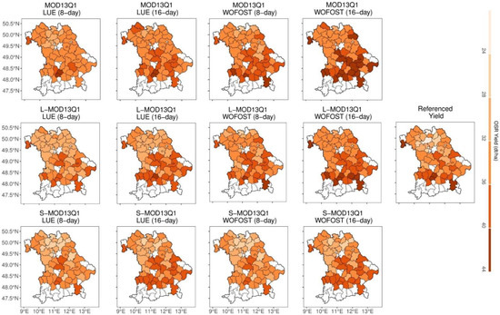 Spatial distribution of referenced yields and predicted yields for WW using MOD13Q1 (8 and 16 days), L-MOD13Q1 (8 and 16 days), and S-MOD13Q1 (8 and 16 days) with LUE and WOFOST models for the state of Bavaria. The white colour represents no data available. A detailed map of the administrative regions of Bavaria is shown in Figure A1.