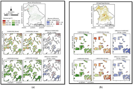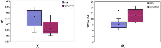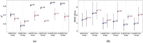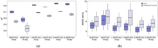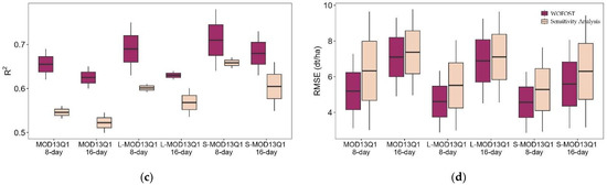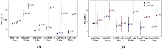 Figure 9a,b displayed that the fused products obtained higher R2 and lower RMSE values than the non-fused products for WW and OSR. For example, L- and S-MOD13Q1 resulted in an R2 = 0.72 and 0.76 and RMSE = 4.91 and 4.49 dt/ha, respectively, and MOD13Q1 resulted in an R2 = 0.63 and RMSE = 5.85 dt/ha. Analysing the different temporal resolutions of 8- and 16-day products with LUE and WOFOST models, the 8-day products (median R2 = 0.77, RMSE= 6.14 dt/ha) resulted in higher R2 and lower RMSE than the 16-day products (median R2 = 0.69, RMSE= 8.0 dt/ha) (Figure 9c,d).