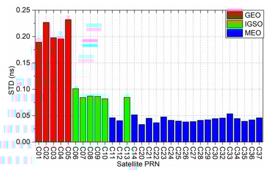 Figure 2 shows that there are 31 satellite clocks including 5 GEO satellites, 6 IGSO satellites, and 20 MEO satellites. The MEO satellite has the highest accuracy of approximately 0.043 ns. The STD accuracy of the IGSO satellite is approximately 0.088 ns, while the GEO satellite has the lowest STD accuracy of approximately 0.208 ns. Due to the influence of larger GEO orbit errors, the accuracy of clock estimation is lower than that of MEO and IGSO satellites [].