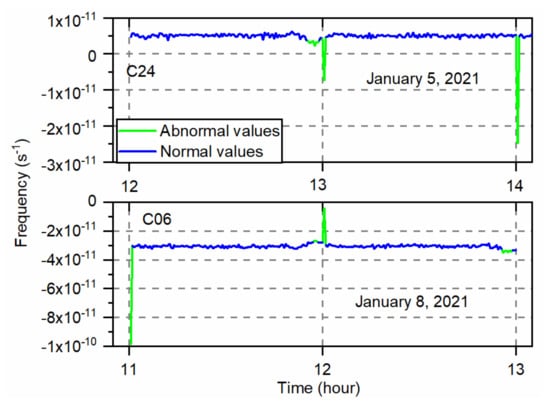 The first example uses the real-time estimated clock offsets of the IGSO satellite C06 on 8 January 2021 and the MEO satellite C24 on 5 January 2021 to illustrate the detection of clock outliers. The frequency detection is more effective than the phase for some isolated outliers since the normal satellite atomic clock frequency is stable during a short-term period. The frequency data and outlier detection results are shown in Figure 4. The blue line shows that most frequency data are stable, and some large frequency points denoted with the green line are detected as outliers. The C06 frequency presents larger fluctuations than the C24 at the hour boundary due to large hourly updated IGSO orbit error. The frequency detection algorithm module can detect hour-boundary biases and remove the corresponding outliers.