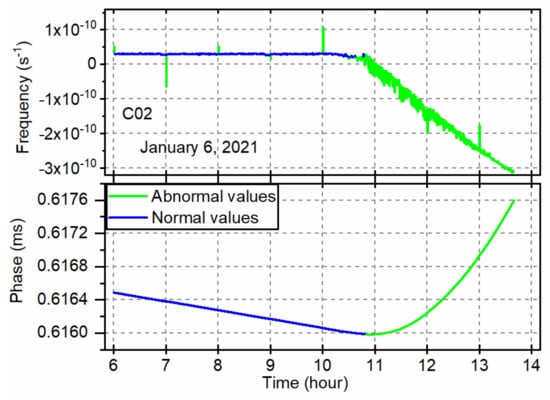 The second example presents the abnormal clock offsets of the GEO satellite C02 caused by frequency modulation on 6 January 2021. Figure 5 shows the frequency modulation on the C02 satellite and abnormal clock detection results. The top and bottom panel is the frequency and phase time series, respectively. As shown by the green line, the proposed algorithm can correctly identify abnormal clock offsets caused by frequency modulation and eliminate abnormal parts. The phenomenon lasts about three hours leading to an obvious trend in the frequency data and a parabolic trend in the phase data. The abnormal clock offsets should be remarked unavailable after the frequency modulation happens to avoid the adverse influence on the PPP.