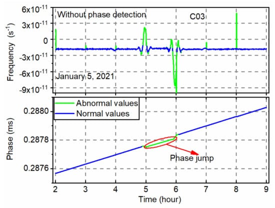 The third example presents the abnormal clock offsets of the GEO satellite C03 caused by phase modulation on 5 January 2021. Figure 6 shows the phase jump on the C03 satellite and abnormal clock detection results. The top and bottom panel is the frequency and phase time series, respectively. The frequency data at the hour boundary fluctuates significantly, but the time series from UTC 05:00 to 06:00 varies stable. The frequency detection part is not effective for the phase jump. However, it can be detected by the phase detection part since all phase data during this period deviate from the primary variation trend. The clock jump value is approximately 10 ns. The phase jump will cause a large interpolation error, which can affect the positioning performance. Therefore, the short-term abnormal clock offsets caused by the phase jump should be detected. As shown by the green line, the proposed algorithm can detect abnormal clock offsets, including large outliers and phase jumps.