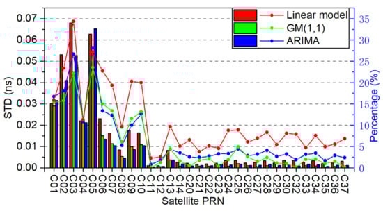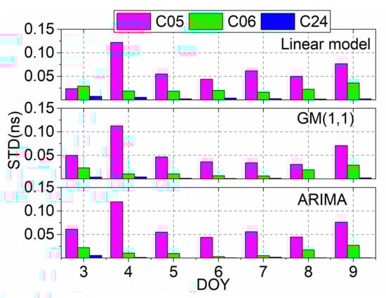To reflect the performance of the linear moving short-term clock detection algorithm, the improved STD accuracy of the real-time estimated satellite clock offsets is assessed in this section after the abnormal clock values are removed. First, the GEO satellite C05, the IGSO satellite C06, and the MEO satellite C24 are selected to analyze the improvement of the clock STD accuracy each day. Secondly, the assessment of average real-time clock performance improvement of all days is carried out on all satellites. The results of the abnormal real-time satellite clocks detected with the grey model and the ARIMA model, respectively, are also compared to the proposed method.