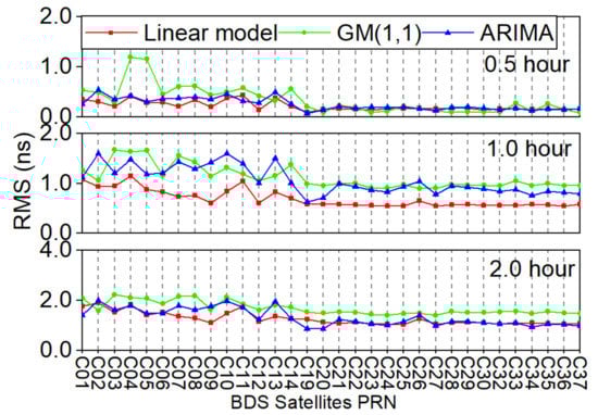Figure 10 reflects the average RMS accuracy of the predicted clock offsets for each satellite with three models, and the corresponding average accuracy for three orbits is shown in Figure 11. In general, the clock prediction accuracy of the GEO and IGSO satellites is worse than the MEO satellites, which is consistent with the above results. The linear model has the best average prediction accuracy, which is 0.214 ns, 0.687 ns, and 1.284 ns for the prediction time length of 0.5 h, 1.0 h, and 2.0 h, respectively. The three orbits’ average prediction accuracy for the GM(1,1) is 0.360 ns, 1.166 ns, 1.768 ns, and 0.263 ns, 1.090 ns, 1.359 ns for the ARIMA model. Besides, the precision of BDS-2 and BDS-3 clock prediction is also consistent with the above. BDS-2 obtains average RMS of 0.289 ns, 0.839 ns, and 1.465 ns for the prediction time length of 0.5 h, 1.0 h, and 2.0 h, respectively. While BDS-3 gets 0.153 ns, 0.569 ns, and 1.099 ns with the linear model. Furthermore, BDS-2 could reach 0.613 ns, 1.317 ns, 1.917 ns, 0.369 ns, 1.327 ns, and 1.655 ns for GM(1,1) and ARIMA with 0.5 h, 1.0 h, and 2.0 h prediction time length. In contrast, BDS-3 gets 0.149 ns, 0.961 ns, 1.500 ns, 0.175 ns, 0.857 ns, and 1.071 ns with a different model. With the increase of the prediction time length, the accuracy of the predicted clock offsets decreases. Thus, it is necessary to adopt the moving short-term clock prediction method for maintaining good prediction accuracy. The clock prediction performance shows that the linear model is more suitable for predicting and detecting abnormal satellite clock offsets in the proposed method.
