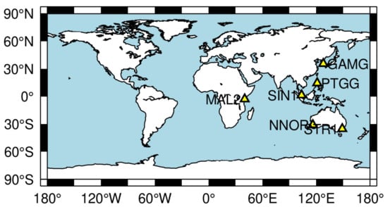 To verify the effectiveness of the proposed method, the real-time kinematic PPP is carried out with the real-time estimated satellite clock products before and after the abnormal clock detection. The PPP model and parameters are displayed in Table 2. Six IGS stations are selected, and the distribution is shown in Figure 12. The undifferenced BDS B1I/B3I phase and code ionosphere-free combination observations and the WHU ultra-rapid orbit products are used in the PPP processing model. To avoid the influence of day-boundary orbit error, the PPP experiment starts from the UTC 2:00 to 22:00 on each day. The daily positioning error of the PPP in the east, north, and up components is computed with respect to the post-processed IGS reference coordinates, and an example of the station PTGG on 4 January 2021 is shown in Figure 13. The average RMS accuracy of all days is presented in Figure 14, and the accuracy improvement is shown in Table 3.