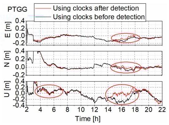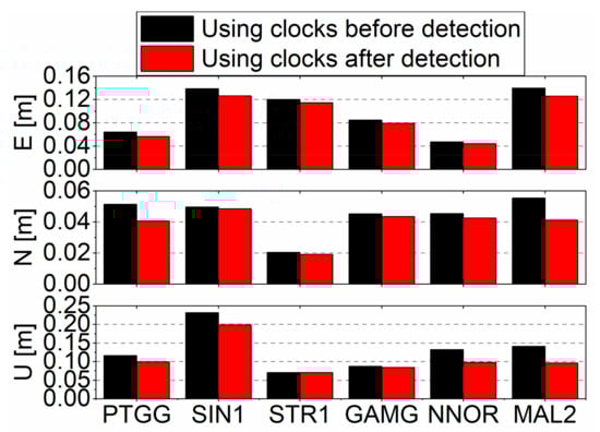 Figure 13 shows that the position errors of the station PTGG are improved significantly from UTC 14:00 to 17:00. This is because many abnormal clock data are detected and removed during this period by the abnormal satellite clock detection. The RMS accuracy in east, north, and up components is improved by 0.004 m, 0.009 m, and 0.026 m, respectively. In general, the horizontal direction improved by 0.010 m. Figure 14 and Table 2 show that the average RMS accuracy with the original real-time clocks amounts to 0.099 m, 0.045 m, and 0.130 m in the east, north, and up components, respectively, while the corresponding accuracies of 0.091 m, 0.039 m, and 0.108 m are achieved with the clocks after removing abnormal values. In comparison, the improvement is 8.1%, 13.3%, and 16.9%, respectively. In other words, the precision of horizontal direction could improve by 8.3% after clock outliers detection. This demonstrates that the abnormal clock detection algorithm could improve the positioning quality of the real-time estimated satellite clock.