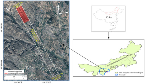 The Shangwan Coal Mine is one of the main production mines of Shendong Coal District by Shenhua Group Co. It is located in Ejin Horo Banner, Ordos City, with an area of about 62 square kilometers and geological reserves of about 1.23 billion tons. The mining area is a semi-arid and arid zone in the transition from arid grassland to desert grassland, and it belongs to a water-eroded gully landform that is windy and sandy all year round. The vegetation is mainly sandy and xerophytic semi-shrub vegetation and grassland. A working face of Shangwan Coal Mine is the study area, with a length and width of about 5000 m × 300 m, the average thickness of the coal seam is 9 m, the design mining height is 8.6 m, the dip angle of the coal seam is about 1~3° [35], the mining depth is 150 m~250 m, and the average daily advance speed is about 14 m. Figure 1 shows the geographical scope and basic situation of the study area. The red part is the area near the open-off cut, with two observation lines of strike and dip on it. The upper right corner is the orbit direction and the LOS direction of the Sentinel-1 SAR data that are used in this paper.