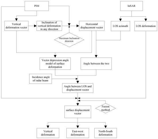 Firstly, we use the PIM to achieve horizontal displacement vector and the vertical displacement vector, and then, the displacement vector depression angle is obtained. Next, the LOS direction and LOS deformation can be determined by the InSAR technology. Then, combined with the LOS deformation of InSAR, the incident angle and azimuth of the radar beam, and the direction of surface horizontal displacement vector, we can acquire the angle between LOS and surface deformation vector. After that, the surface deformation vector is obtained. Finally, after fusing the results of InSAR+ vector depression angle model and PIM, the surface displacement vector of the whole basin could be determined. The specific flow is shown in Figure 3.