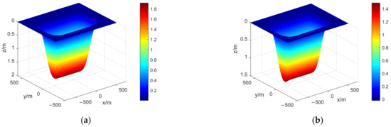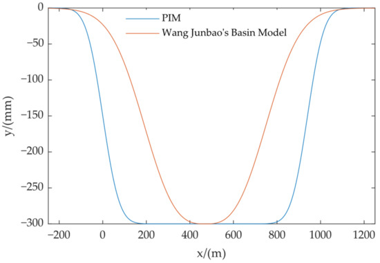 where n is the model parameter. This formula is applicable to the coal seam with small dip angle. When the dip angle of the coal seam is large, the dip direction of the subsidence basin is asymmetric, and two models can be constructed by replacing the parameters b in Equation (11) with b1 and b2 to describe the surface subsidence in the uphill and downhill directions, respectively. According to the analysis of Wang Junbao, the model has good applicability when the working face is short and the mining is insufficient [38]. If the working face is long, its accuracy needs further discussion. Assuming that there is a working face with a length and width of , and the main influence radius r is 150 m, the half lengths of the basin are 300 m and 1000 m, respectively (at this time, the strike main section has reached the ultra-full mining). The obtained subsidence basin according to Formula (11) is shown in Figure 5.
