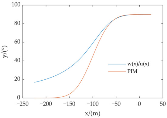 The settlement at the inflection point (x = 0) of the PIM subsidence curve is one half of the total subsidence, and of the depression angle at the inflection point is . The of (9) at x = 0 is , which is consistent with the actual situation. However, if the PIM is directly used to describe the depression angle, the depression angle at the inflection point is one half of the maximum value, which is 45°, and equals 1, which is not necessarily equal to 1/(2b), indicating that the PIM is not necessarily suitable for the depression angle model. Figure 7 shows the schematic diagram of the comparison between the two methods. The depression model in (12) is consistent with the actual situation at the inflection point, and the convergence in the edge area is gentler than that of PIM, which is conducive to the depression angle estimation in the edge area.