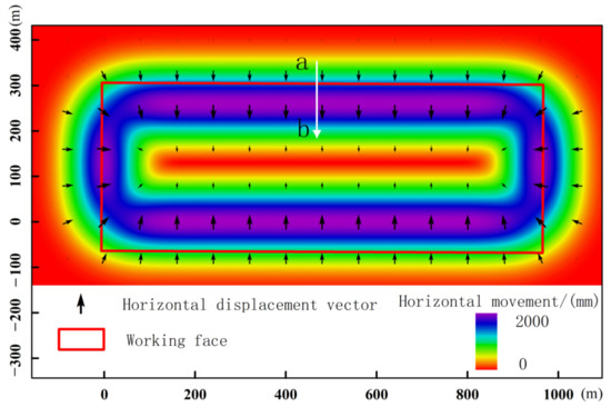According to the law of the displacement vectors of surface points in the subsidence basin, they all point to the center of the goaf. It is therefore considered that the horizontal movement directions of the surface points from the edge of the subsidence basin to the nearest maximum subsidence points. For instance, the surface points on line ab in Figure 9 have the same horizontal movement directions pointing to the nearest maximum subsidence point, which is consistent with the maximum inclination direction (determined by (15)) of the surface subsidence. This shows that this law can determine the horizontal movement direction of any point on the surface of the subsidence basin.