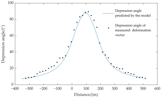 The horizontal displacement is calculated according to the measured leveling data of the working face and the plane coordinates measured by GNSS-RTK. Taking the dip main section as an example, the displacement vector depression angle of the surface point is calculated. Then, we used the measured data to calculate the parameters of PIM, and we achieved the following parameters: = [0.7; 2.2; 0.37; 55] ( are subsidence factors, the tangent of the mainly affecting radius, the horizontal movement coefficient, and the deviation of inflection point, respectively), and substituted the parameters into (17). Figure 9 shows the depression angle that was calculated from the measured value and the depression angle that was predicted by the model. As shown in Figure 10, these depression angles have a high degree of coincidence; the determination coefficient R2 is 0.9981, and the root mean square error (RMSE) is 2.9°, indicating that the model has good applicability. As the working face is a nearly horizontal coal seam, the maximum subsidence point is located at the center of the basin, and the depression angle of the displacement vector of this point is 90°. The depression angle on both sides of the working face is smaller, revealing that the farther away from the mining area, the closer the surface point moves horizontally.