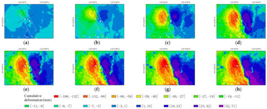 Time-series accumulated settlement of InSAR: (a) 12 April 2018, (b) 18 May 2018, (c) 23 June 2018, (d) 29 July 2018, (e) 22 August 2018, (f) 27 September 2018, (g) 18 February 2019, and (h) 13 May 2019.