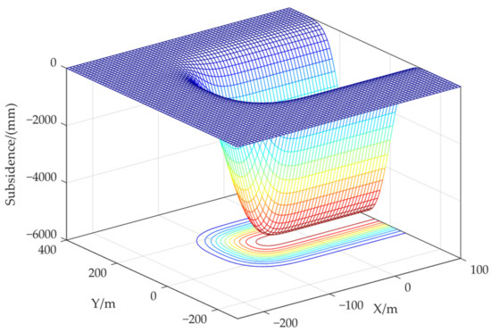The inverted parameters of the PIM based on the measured leveling values are [0.7; 1.7; 2.2; 25; 55], and the depression angle of the coal seam near the open-off cut is nearly 0°. Thus, the parameters of the uphill directions and the downhill directions are the same. We substitute the above parameters into (5) to obtain the subsidence basin near the open-off cut, as shown in Figure 12.