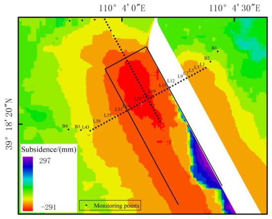 From the above analysis, the surface subsidence and the 3D displacement vector are obtained based on ε, β, and the LOS deformation obtained from InSAR.
