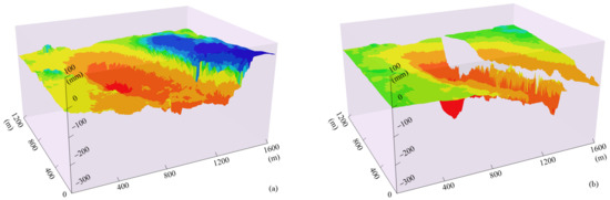 For the convenience of comparison, suppose there is a horizontal working face with an east–west main section, whose length and width are 1000m and 300 m, respectively. According to the maximum settlement of 2 m, the 160 m main influence radius, the 0.3 horizontal movement coefficient, and the 20 m inflection point offset, a subsidence basin is generated as the actual subsidence basin, and is then used to simulate the LOS subsidence basin of the InSAR technology. The basic parameters of the SAR data are as follows: ascending orbit, LOS azimuth is 83.9°, and the radar incidence angle is 40°. Figure 21 shows the subsidence basin obtained by the PIM and the simulated LOS subsidence basin. It can be seen from Figure 21b that on the side of the goaf of the open-off cut, the subsidence of some areas in the LOS subsidence basin is greater than that in the center of the basin. This is because the deformation in the LOS direction is equal to the sum of the projections of the subsidence and horizontal movement in the LOS direction. When both projections have the same direction with LOS, it may occur that the deformation value in the LOS direction is greater than the deformation of the basin center. If both projections are in the opposite direction and the projection value of the horizontal movement is greater, then the surface is uplifted.
