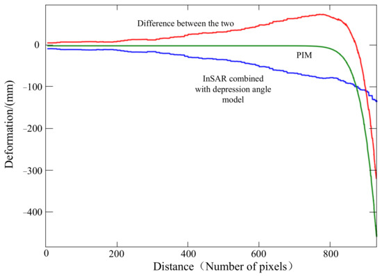 Figure 17 compares the PIM prediction results with InSAR combined with the depression angle model for monitoring the results, based on pixel values of a line segment on the dip main section in the edge area of the subsidence basin. Figure 17 shows the variation trend of subsidence obtained by these two methods. From the edge of the basin to the center of the basin, the subsidence of InSAR combined with the depression angle model increases slowly, and the PIM subsidence changes from almost no change to a rapid increase. The intersection point is shown with equal subsidence. On the left side of the intersection point, the subsidence value of InSAR combined with the depression angle model is closer to the true value. On the right side of the intersection point, the PIM subsidence value is closer to the true value. This shows that the party that has a large sinking value should have a greater weight in the fused value, which is more consistent with the actual situation. Accordingly, a fusion method weighted by distance is proposed innovatively. This method is like taking the distance from the point on the sinking curve in Figure 17 to the horizontal axis as the weighting coefficient. Thus, when the sinking value is larger, the weight is also larger.