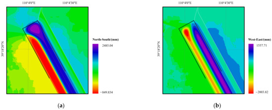 The range of the white, solid line in Figure 18 is the area nearly perpendicular to the LOS direction and the displacement vector, revealing no effective monitoring value of InSAR. Thus, the area in this figure is only the predicted value of the PIM. Therefore, effective surface deformation of some parts of the area is not obtained for some mining areas with the local LOS uplift. The 3D displacement vector of the surface can be expressed in the form of a horizontal movement direction field, a displacement vector depression angle field, and a subsidence. It can also be converted into the form of subsidence, such as an east–west horizontal movement field and a north–south horizontal movement field. The horizontal movement in the east–west and north–south directions is shown in Figure 19.