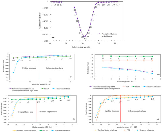 Here, we take the 610 mm settlement result above the open-off cut as the upper bound of the threshold value, and when the settlement limits is greater than 610 mm, the result of the PIM is taken as the final value. When the settlement is between 70 mm and 610 mm, the final settlement d is obtained by the weighted average between of the PIM and the settlement of the InSAR combined with the depression angle model, and (21) is the fusion method. It is easier to compare this with the method of Chen, Y. et al. [30], and the weight changes dynamically in different positions, which is more consistent with the facts.