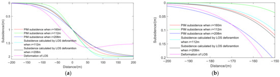 Figure 23 shows the subsidence calculated by the PIM and the subsidence curves calculated by InSAR combined with the depression angle model when r is 112 m and 208 m. It can be seen from the figure that the LOS deformation monitored by InSAR are quite different from the actual subsidence, which indicates that in many cases, the mining area surface deformation obtained by single LOS InSAR cannot replace the actual subsidence. At the side of the coal wall of the open-off cut, the subsidence error calculated by the PIM caused by the deviation of r is far greater than that calculated by InSAR combined with depression angle model. Figure 23b shows the enlarged view of the edge area. At −100 m of the actual subsidence of about 0.12 m, the subsidences calculated by InSAR combined with the depression angle model are 0.1 m and 0.125 m, respectively, with relative errors of about 16% and 4%, and the absolute error magnitude is also small, while the subsidences calculated by PIM are 0.04 m and 0.21 m, respectively, and the relative errors are about 67% and 75%. At the side of the open-off cut goaf, the relative error between the subsidence calculated by InSAR combined with depression angle model and the subsidence calculated by PIM is about 6%, but due to the large settlement, the error magnitude is not small. In the fully mined area, except for the LOS deformation monitored by InSAR, the subsidence of each method tends to be consistent. The above analysis shows that in the edge area of the side of the coal wall, the vector depression angle model with low accuracy r combined with InSAR can obtain a more accurate vertical deformation.