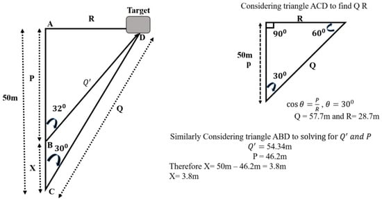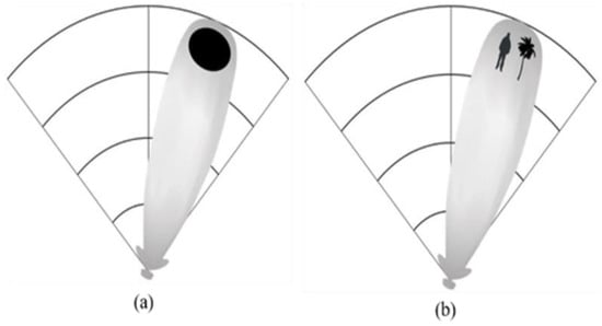where is the velocity of the waves in the medium, and the Doppler frequency changes the speed of sound propagating in the air equal to (331 + 0.6 T). Figure 2 and Figure 3 demonstrate the complete setup of the proposed principle in estimating angular Doppler frequency when two objects are in one beam. The ultrasonic sensor is mounted to a vehicle transmitting ultrasound, and the objects are stationary. The car is moving at a speed of the Doppler frequency of is shifted by , and similarly, the Doppler frequency of is shifted by . The angular is calculated using Equation (8), respectively.