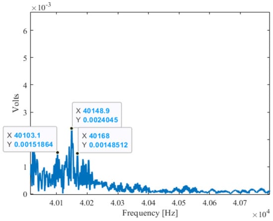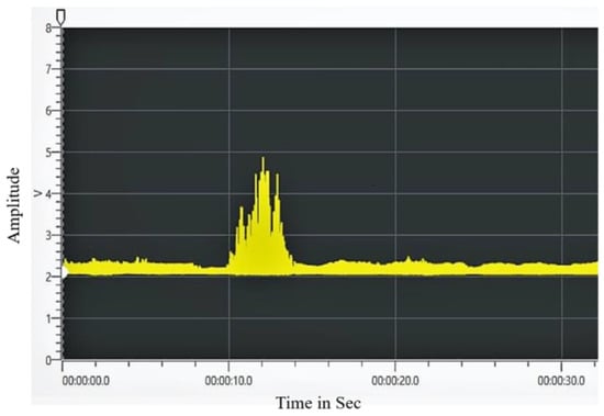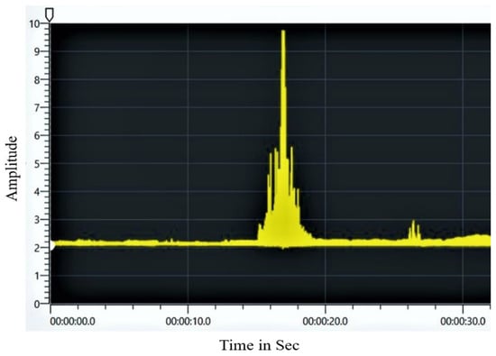Figure 8 depicts the Doppler frequency shift of the received signal from the objects as DAQ acquired it in the time domain. This frequency shift may be attributed to the number of objects under a single beam. After that, the signal is processed to estimate the objects’ azimuthal angles accomplished by first transforming the signal into the frequency domain by applying the FFT. Then, the signal is processed to calculate the angle.