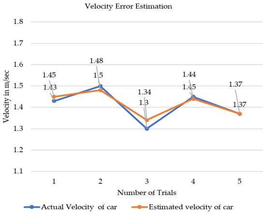 The velocity estimation error of the car is calculated as the difference between the actual and estimated values for different trials.