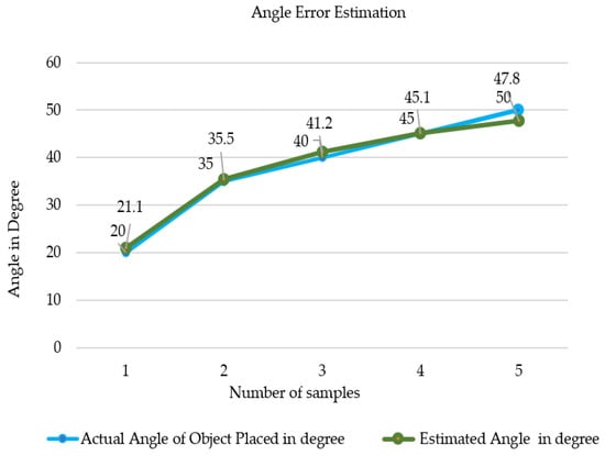 Figure 13 shows the angle error estimation of the proposed method of calculating the azimuthal angle through the Doppler shift. As a result of analyzing the acquired data, it was confirmed that values within the error range were obtained and that the number of objects and peak values were proportional and had a percentage error of less than 3%. The measured data and relative error in the azimuthal angle were summarized in Table 4. We may conclude that a non-linear relationship exists between the actual and estimated angles obtained through signal processing. The data calculated are almost the same. Thus, with high accuracy, an automobile’s developed quantitative remote sensing model can measure the object’s azimuthal angle under a single ultrasonic beam. The experimental results verified that it is possible to classify objects and estimate the azimuth using the Doppler shift phenomenon when several objects are within one ultrasound beam. The findings suggest that the error in the measured and calculated values is less than three percent on average, as shown in Table 5.