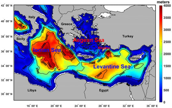 The study area covers latitudes from 30° to 41°N and longitudes from 13° to 36.5°E, as demonstrated in Figure 1. The EMED is divided into three sub-basins (i.e., Levantine, Ionian and Aegean, see Figure 1).
