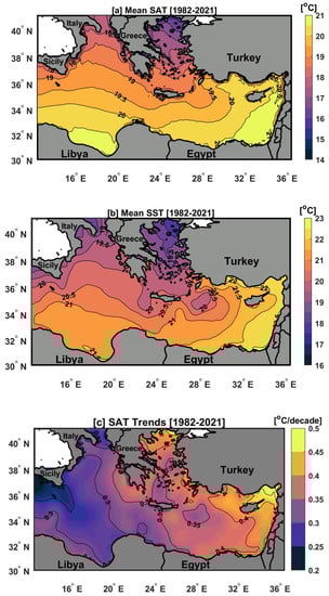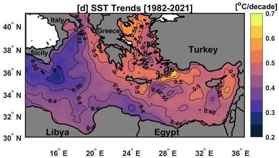 Figure 2a–d show the spatial distribution of mean values and trends for atmospheric and oceanic temperatures over the last four decades (1982–2021). The highest climatological mean values of SAT (>20 °C) and SST (>22 °C) were found along the African coast and in the eastern part of the Levantine Basin (Figure 2a,b), whereas the lowest values (<18 °C) for both SAT and SST were observed in the northern part of the Aegean Sea and in the southern Adriatic Basin (Figure 2a,b). There was a gradual decrease in both temperatures from south to north and from east to west of the EMED, in agreement with [23,57]. Statistically significant (p < 0.05) trends were observed for both atmospheric and oceanic temperatures over the whole EMED (Figure 2c,d). There were significant spatial variations in atmospheric and oceanic temperature trends, with the largest atmospheric temperature trend (>0.45 °C) identified in the north-eastern part of the Levantine Basin. The Aegean and Levantine Basins had larger SST trends (>0.5 °C/decade), while the Ionian basin had lower values (<0.3 °C/decade). The maximum SST trend (>0.6 °C/decade) was observed in the Rhodes cyclonic Gyre region, which could be due to the higher SST variability in this area, as described by [51]. The basin average warming trends for SAT and SST were about 0.38 ± 0.08 °C/decade and 0.43 ± 0.05 °C/decade, respectively, over the whole study period. The spatial pattern of the SST trend was in good agreement with that reported by [58]. In that study, a stronger SST trend was found in the Levantine Basin, with values up to 0.6 °C/decade in the Cretan Arc and west and south of Cyprus, while a much weaker warming (0.1 °C/decade) was found southeast of Crete. Our SST trend was slightly higher than that observed by [15], which found an average SST trend of about 0.33 ± 0.04 °C/decade for the EMED basin from 1982 to 2020. This increase could be due to the use of a high-resolution dataset (0.05° × 0.05°).