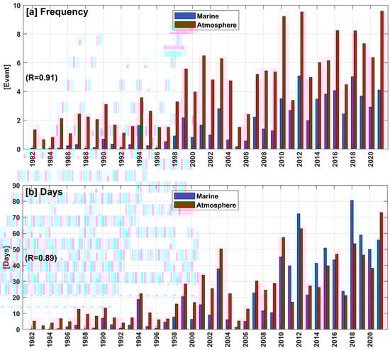 In this section, we calculated the occurrence and total days of AHWs and MHWs throughout the study period (Figure 7a,b) and then focused on the co-occurrence of events in 2021 as a case study. During the study period, the total number of AHW events for each year was always higher than that of MHW events (Figure 7a). The total number of MHW days exceeded that of AHW days in the last decade, except for in 2013, 2015 and 2021 (Figure 7b). There were 172 AHW events and 62 MHW events, with 33 events of AHWs and MHWs occurring together, accounting for 53% of the total MHWs events (Figure 7a,b). This implies that more than half (53%) of the MHWs recorded throughout the study period occurred simultaneously with AHWs, while the remaining percentage (47%) could be due to other causes such as oceanic processes (i.e., heat advection by ocean currents that can aggregate areas of warm water) rather than AHWs.