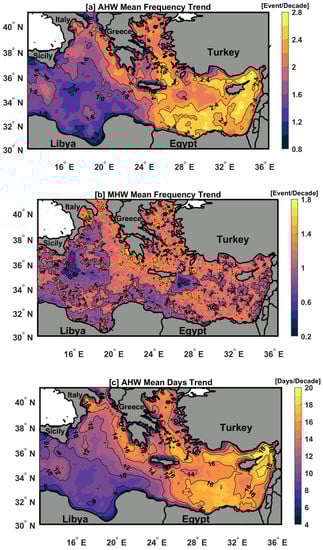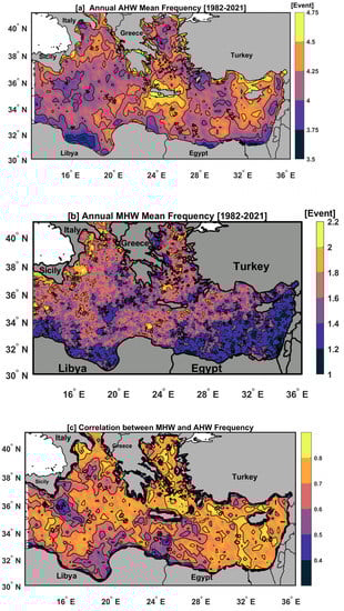 Figure 4a–c show the spatial distribution of annual mean AHW and MHW frequencies and the relationship between them from 1982 to 2021. Annual AHW frequencies ranged from 3.5 to 4.75 events, with the highest values (>4.5 events) around Cyprus and Crete (Figure 4a). The lowest AHW frequencies (<3.75 events) were found along the African coast of Egypt and Libya. The Ionian Basin generally has a lower AHW frequency than the Levantine Basin (see Figure 4a). The MHW frequency was higher in the northern Ionian and Aegean Seas (>2 events) than in the Levantine Basin (<1.4 events) (Figure 4b). These spatial distributions of the MHW frequency findings generally agree with those of [15], except for the southern and eastern parts of Sicily, which have a higher MHW frequency (>1.8 events; Figure 4b). This could be due to the use of high resolution (0.05° × 0.05°) SST data.