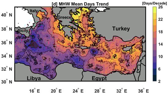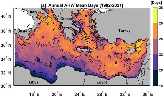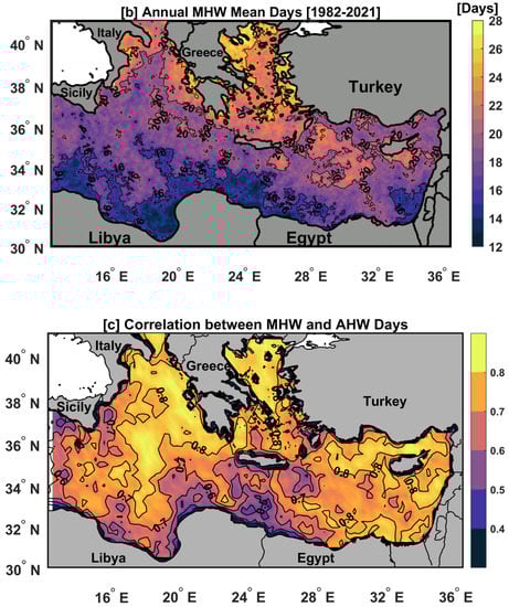 Figure 5a–c depict the spatial distribution of annual mean AHW and MHW days and the correlation between them during the study period. The annual AHW days ranged from 18 to 28 days (Figure 5a). The highest AHW days (>27 days) were in northern Cyprus (Levantine basin), with the lowest values (<20 days) along the Libyan coast (Ionian basin). The Ionian Basin generally had lower MHW days than the Levantine Basin (see Figure 5b), and the highest MHW days (>24 days) were observed in the Aegean Sea. The spatial distribution of the correlation between the AHW and MHW days is highly significant for most of the study area, with a correlation greater than 0.7, except for the Libyan coast and the southern coasts of the islands of Crete and Sicily in the Ionian basin, where the correlation is less than 0.5 (Figure 5c).