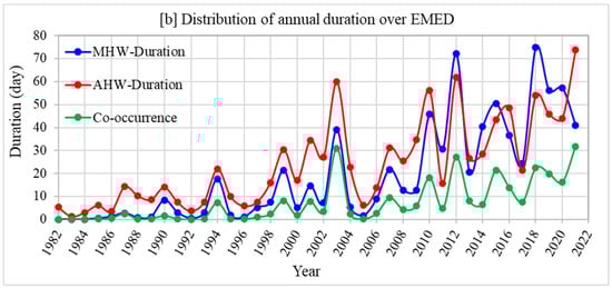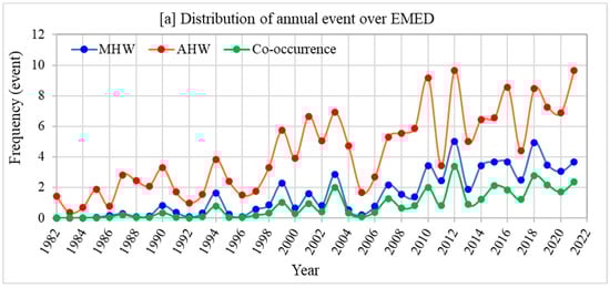 The distribution of annual events and days of AHWs, MHWs and their co-occurrence in each year was estimated as the average incidence across all grid cells over EMED, while their total frequency distribution was computed as an aggregate over all grid cells during all years of the study period using the method of [28].