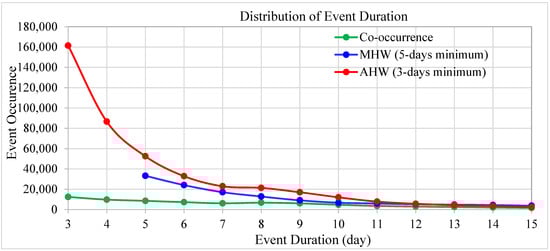 Frequency distribution of event durations of AHWs, MHWs and their co-occurrence for all grid cells within EMED from 1982 to 2021.