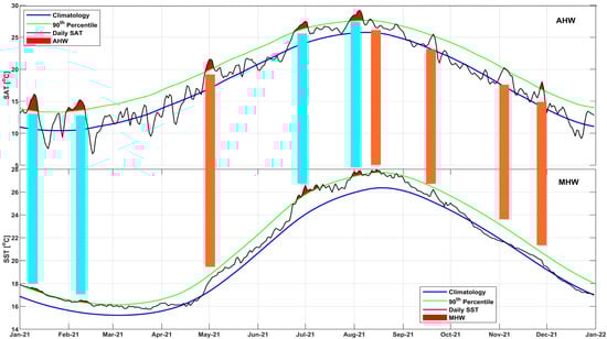 The 2021 co-occurrence of AHW (upper panel) and MHW (lower panel) events; the red shaded areas refer to the AHW/MHW events. The black solid line defines the SAT/SST (°C), the blue solid lines indicate the SAT/SST (°C) climatology, and the green solid lines denote the 90th percentile for SAT/SST (°C). The cyan and orange bars indicate the co-occurrence and stand-alone events, respectively.