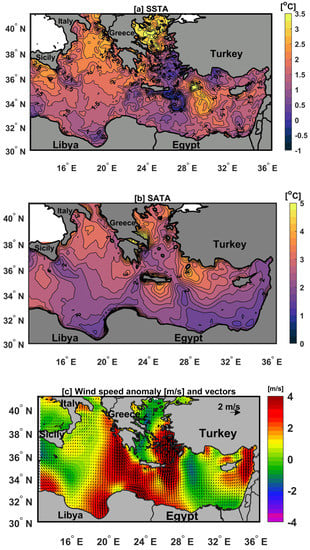 We wanted to gain better insight into the SST and atmospheric condition (SAT and wind components) anomalies during the summer co-occurrence event which lasted for 8 days from 29 July to 5 August 2021 (Figure 10a–c). The spatial distribution of the average SSTA during this event (Figure 10a) ranged from [−1] to 3.5 °C, with maximum anomalies (>2 °C) in most of the Aegean Sea and south of Rhodes Island (Rhodes gyre cyclonic location [58]), with an average 1.52 °C over the whole EMED. The atmospheric conditions during this event revealed warm atmospheric temperature anomalies over the entire EMED (Figure 10b) that ranged from 0 to 5 °C. The highest SATA values (>4 °C) were observed over the most of Aegean Sea and south of Rhodes Island, which coincide with the same regions of the most intense MHWs and highest SSTA (Figure 10a). There is an interesting resemblance in the pattern between the wind speed anomaly, SSTA, and SATA, where the locations of maximum temperature anomalies were coincident with a reduction in the magnitude (<0 m/s) of the wind speed fields (Figure 10c). That the comparison of wind speed patterns and temperature anomalies fields is related to the AHW and MHW extreme events could be related to insufficient wind speed; examples of similar findings can be found in [15,34,67,68].