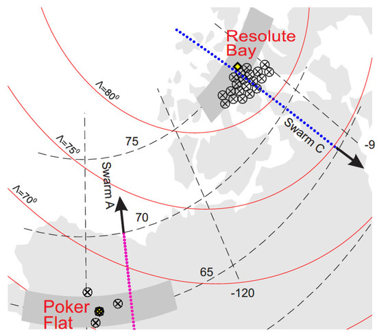 This study compared the Swarm data with measurements of two ISRs, one in the polar cap at Resolute Bay (RB) and another in the auroral zone at Poker Flat (PF). Both radars are modular-type systems capable of quickly repositioning their beams and inferring the electron density in multiple range gates up to 600–700 km in height [39,40].