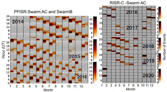 Figure 2 shows that for the PFISR-AC comparison, all months and UT sectors were covered cumulatively over 2.5 years, albeit not very uniformly, with some very limited gaps. The number of PFISR-B conjunctions was about two times smaller because for the PRISR-AC comparison, data from both satellites were combined into one data set.