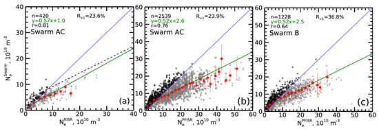 (a) Electron densities measured onboard the Swarm AC satellites versus electron densities measured by the Resolute Bay incoherent scatter radar RISR-C. Darker circles reflect measurements with NeSwarm/NeRISR > 1. Red solid dots are medians of NeSwarm in bins of NeRISR (size of the bin is 2 × 1010 m−3). Vertical red bars are the binned values of NeSwarm +/− one standard deviation of NeSwarm. The green line is a linear fit line. The dashed line is a linear fit line reported by Larson et al. [36]. (b) The same as (a) but for the Swarm AC conjunctions with PFISR. (c) The same as (b) but for the Swarm B conjunctions with PFISR.