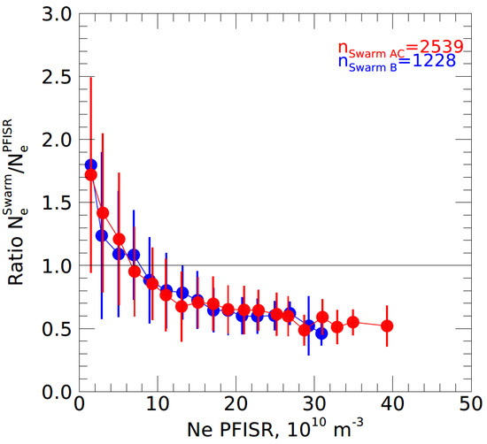 Medians of the ratio R = NeSwarm/NePFISR as a function of the electron density measured by PFISR, NePFISR. The bins of NePFISR have a step of 2 × 1010 m−3. Vertical bars for each bin are the median value of the ratio +/− one standard deviation of the ratio. Red and blue colors characterize data for PFISR conjunctions with Swarm AC and Swarm B, respectively.