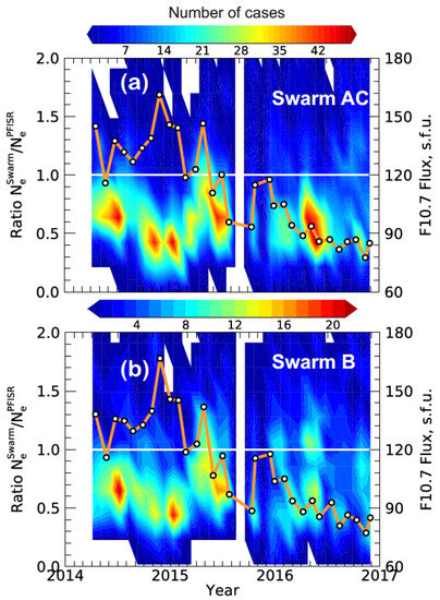 Figure 6 shows a contour plot for the number of cases of ratio R = NeSwarm/NePFISR as a function of time between 2014 and 2016, with the red-pink color corresponding to the largest counts. Overlaying the contours is a black line (connecting white circles) representing the monthly median values of the F10.7 cm radio flux. In the text to follow, we will simply call the solar flux F10.7. The scale for the flux is on the right Y axis.