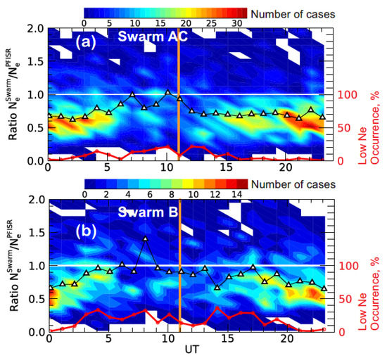 (a) A scatter plot for the occurrence of ratio R = NeSwarm/NePFISR for Swarm AC versus UT time of radar–satellite conjunctions. The scale for R is represented by the bar at the top. The overlaid black-white triangles are hourly median R values. The overlaid red line is the occurrence of low electron densities with NePFISR < 3 × 1010 m−3, given in percent of the total number of measurements for each one-hour bin. The vertical beige line denotes local midnight. The scale for the occurrence is shown on the right (y) axis. (b) The same as (a) but for the PFISR-Swarm B conjunctions.