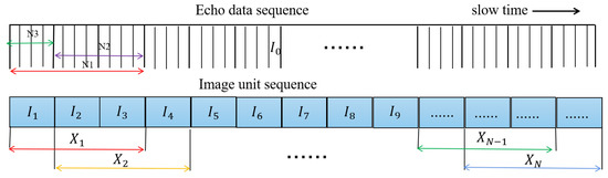 As shown in Figure 2, for the given video SAR data, each echo data are used to form an image X, and the overlapping ratio is set to . The number of same echoes between adjacent frames is , . Correspondingly, the number of different echoes between adjacent frames is . We calculate the greatest common divisor M among , , and . M is the number of pulses contained in the smallest image unit I. Here, the BP imaging algorithm is used to generate image unit I.