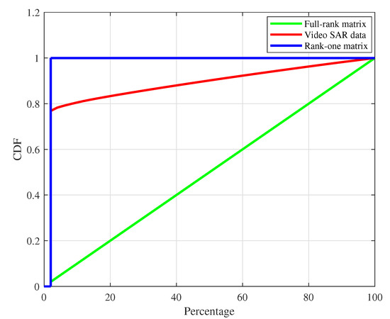 It is a fact that the information contained in a matrix can be represented by its singular values [38]. In general, there is a strong correlation between each column of a rank-one matrix. The information contained in this matrix is less and is concentrated on its unique singular value. As for the full-rank matrix, the correlation between each column is weak, and its information is uniformly distributed on each singular value, as shown in Figure 3. From Figure 3, it can be seen that the CDF of video SAR data matrix is very close to the CDF of the rank-one matrix, and the top 10% singular values capture 80% information of O. It indicates there is a strong correlation between each column of O. Correspondingly, the matrix O has a sufficient low-rank property. Therefore, it is reasonable and appropriate to adopt the LRSD method to obtain the background and the foreground.